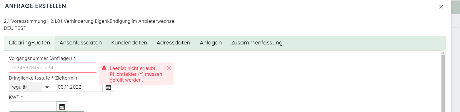 Sobald ein Pflichtfeld nicht ausgefüllt ist, erhalten Sie automatisch einen Hinweis, dass das Feld nicht leer sein darf.
