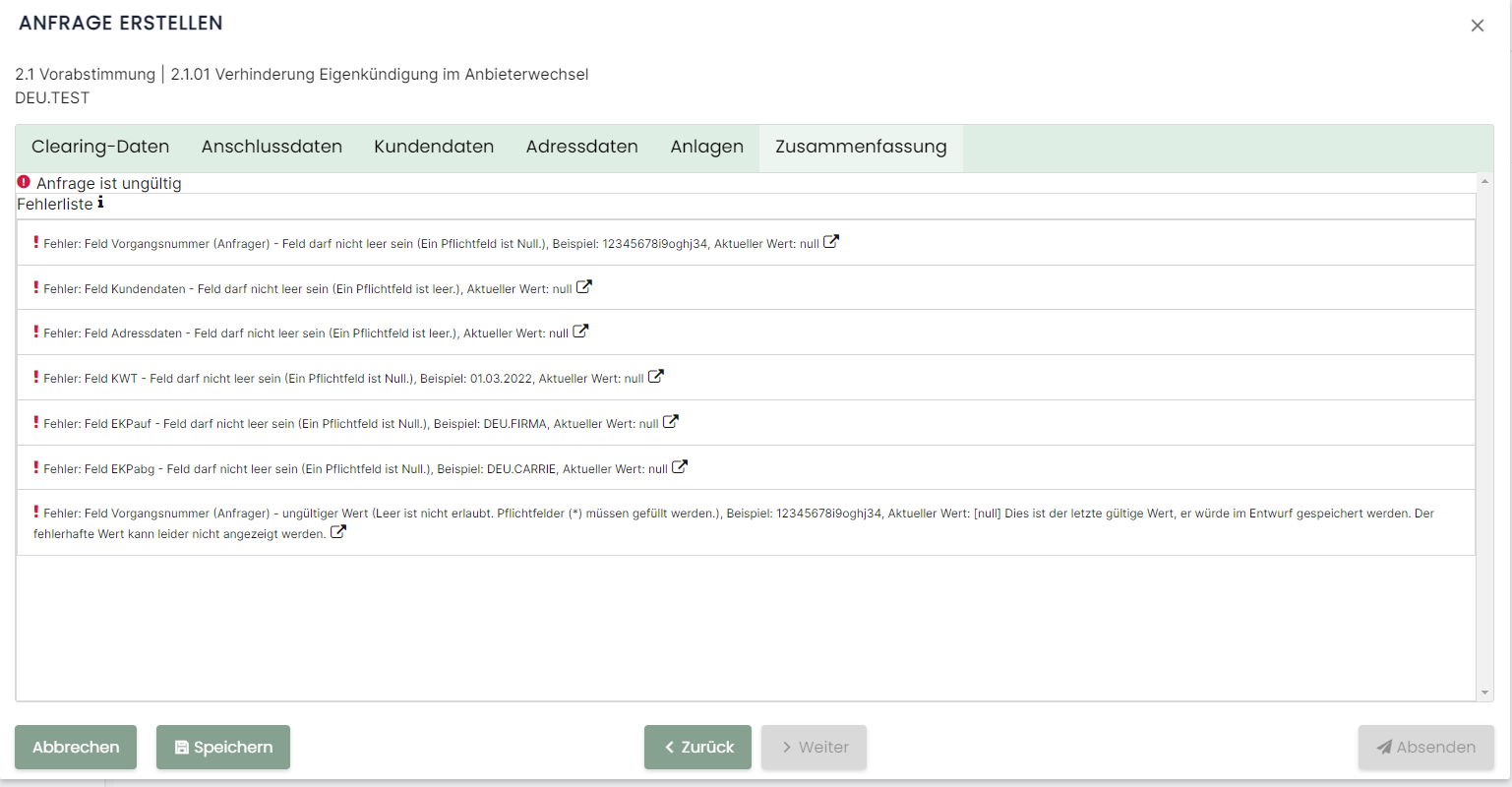 Per Klick auf den Button "Prüfen" haben Sie ebenso die Möglichkeit über Zusammenfassung direkt auf die Fehlerliste zuzugreifen. Sollten mehrere Pflichtfelder nicht ausgefüllt worden sein, können Sie diese direkt über die Fehlerliste einzeln abrufen sowie ausfüllen.